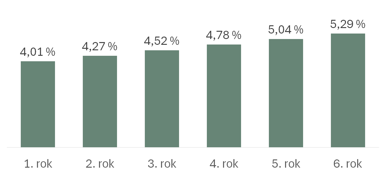 Budeme předpokládat, že spořicí účet bude v prvním roce úročen sazbou 4,01 %, ale každých 12 měsíců se úroková sazba zvýší o stejnou hodnotu. Lze tedy spočítat, jak velké by muselo být každoroční navýšení úrokové sazby spořicího účtu, aby se vyrovnal stavebnímu spoření od Buřinky.