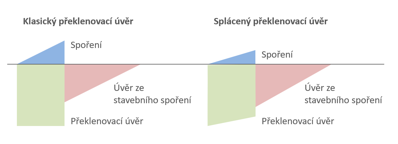 Zpočátku stavební spořitelny nabízely pouze klasické překlenovací úvěry. U klasických překlenovacích úvěrů se překlenovací úvěr nesplácí – klient platí jen úroky, takže jistina zůstává stejná (podobně jako v pohádce zmíněné v úvodu). Namísto splátek jistiny klient spoří na účtu stavebního spoření. V okamžiku, kdy je možné poskytnout úvěr ze stavebního spoření, je překlenovací úvěr částečně splacen naspořenou částkou a zbytek je převeden na úvěr ze stavebního spoření. Později se však začaly objevovat nové varianty překlenovacích úvěrů, mezi nimi i splácený překlenovací úvěr. Od klasického se liší tím, že je splácený, tedy jeho jistina se postupně snižuje. Klient sice stále spoří na účet stavebního spoření, ale spoří menší částku, aby byl schopen umořovat překlenovací úvěr.Dnes (říjen 2025) nabízejí splácené překlenovací úvěry Buřinka a Raiffeisen stavební spořitelna. Obě spořitelny mají podmínky nastavené tak, že na účet stavebního spoření klient platí 0,1 % výše úvěru, zbytek jde na úrok a úmor překlenovacího úvěru.
