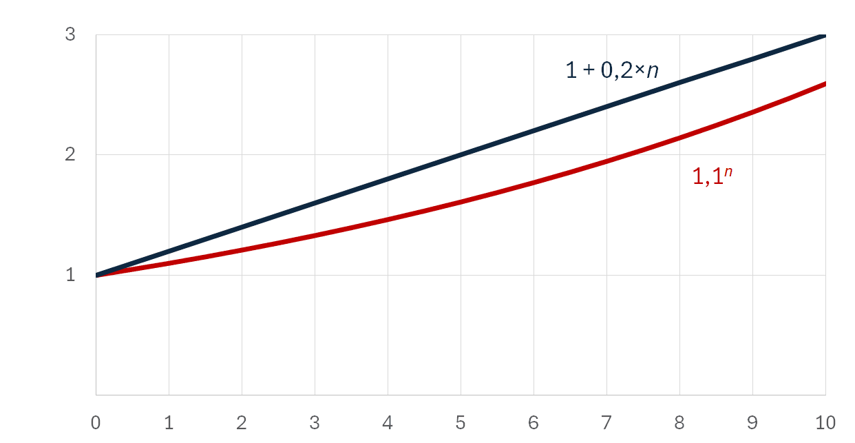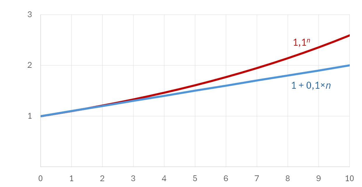 Začněme tím nejjednodušším. Snad každý ví, že složené úročení dává vyšší úrok, než úročení jednoduché. Velí tak i selský rozum – když se budou úročit i úroky, bude úrok vyšší. Při jednoduchém úročení bude po uplynutí n období naspořená částka1 + 1 × 10 % × n.