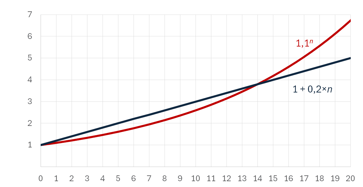 Naspořená částka skutečně poroste rychleji a během prvních deseti let bude přesvědčivě vyšší, než složený úrok při poloviční (desetiprocentní) úrokové míře. Počkejme ale několik let. Ve 14. roce složený úrok (exponenciála) dohoní jednoduchý úrok (lineární funkci) a dále bude jen navyšovat svůj náskok. Asi netřeba říkat, že ani s dalším zvyšováním úrokové míry bychom nepochodili. Pro libovolně vysokou úrokovou míru stačí jen nějakou dobu počkat a exponenciála (složený úrok) ji předhoní. Je to „jen“ otázkou času. Můžeme ale zkusit něco jiného.