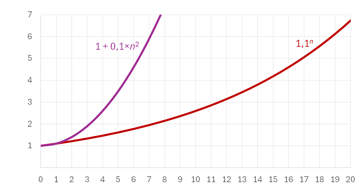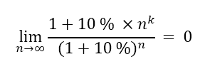 Tím se dostáváme k podstatě věci. Dá se totiž matematicky dokázat, že složený úrok (exponenciála) v dlouhodobém horizontu roste rychleji, než úrok vyjádřený mocninou libovolného (konečného) řádu. Tedy i kdyby byl úrok vyjádřen jako 10 % × n3333, vždy bude dlouhodobě méně výhodný, než složený úrok. I když v některých případech bude tato „dlouhodobost“ skutečně hodně dlouhá.Matematicky se dá tato myšlenka vyjádřit tak, že vytvoříme zlomek. Ve jmenovateli bude jistina při složeném úročení po uplynutí n období, tedy (1 + 10 %)n. Do čitatele dáme jistinu při mocninném úročení, kde úrok po n obdobích bude 10 % × nk, kde k je libovolné číslo. Pro jednoduché úročení je k = 1, pro kvadratické úročení, které jsme zkoušeli výše, je k = 2. Ale ukážeme, že úvaha platí pro libovolně vysoké k.