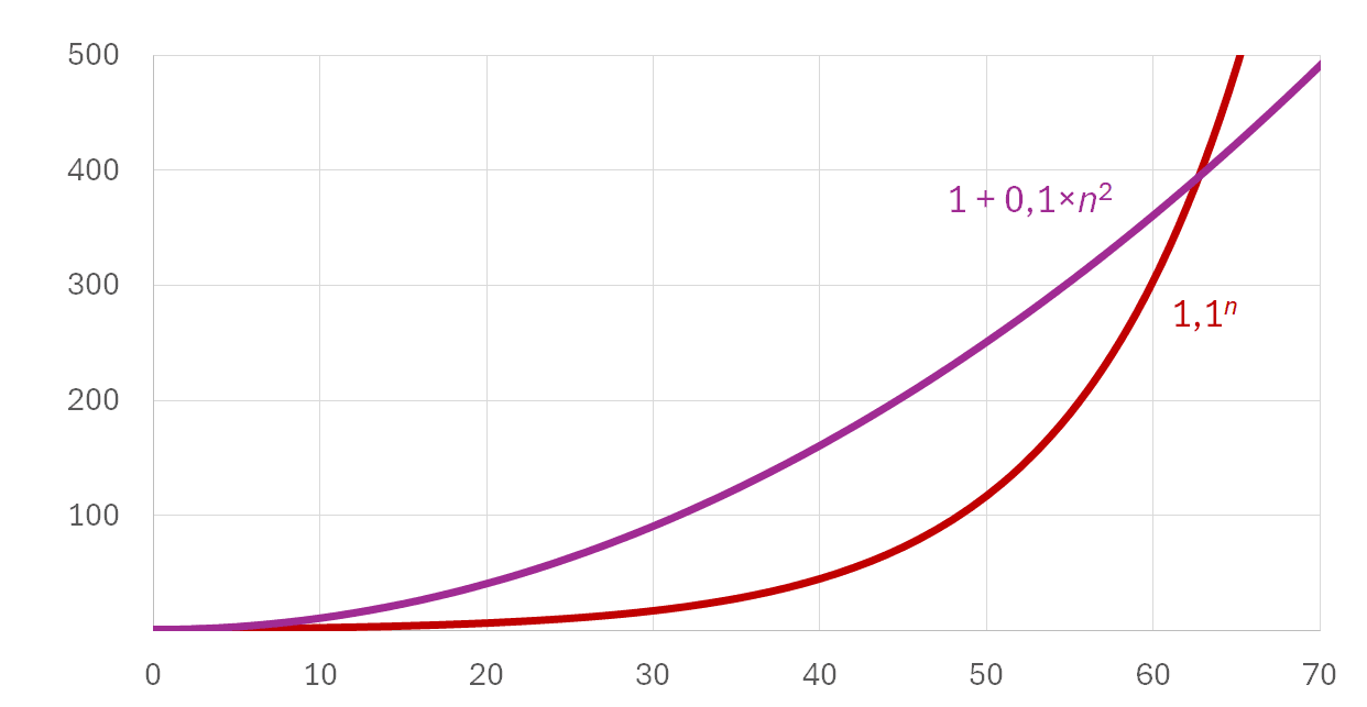 Tím se dostáváme k podstatě věci. Dá se totiž matematicky dokázat, že složený úrok (exponenciála) v dlouhodobém horizontu roste rychleji, než úrok vyjádřený mocninou libovolného (konečného) řádu. Tedy i kdyby byl úrok vyjádřen jako 10 % × n3333, vždy bude dlouhodobě méně výhodný, než složený úrok. I když v některých případech bude tato „dlouhodobost“ skutečně hodně dlouhá.Matematicky se dá tato myšlenka vyjádřit tak, že vytvoříme zlomek. Ve jmenovateli bude jistina při složeném úročení po uplynutí n období, tedy (1 + 10 %)n. Do čitatele dáme jistinu při mocninném úročení, kde úrok po n obdobích bude 10 % × nk, kde k je libovolné číslo. Pro jednoduché úročení je k = 1, pro kvadratické úročení, které jsme zkoušeli výše, je k = 2. Ale ukážeme, že úvaha platí pro libovolně vysoké k.