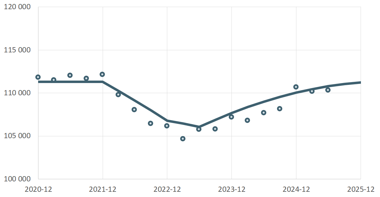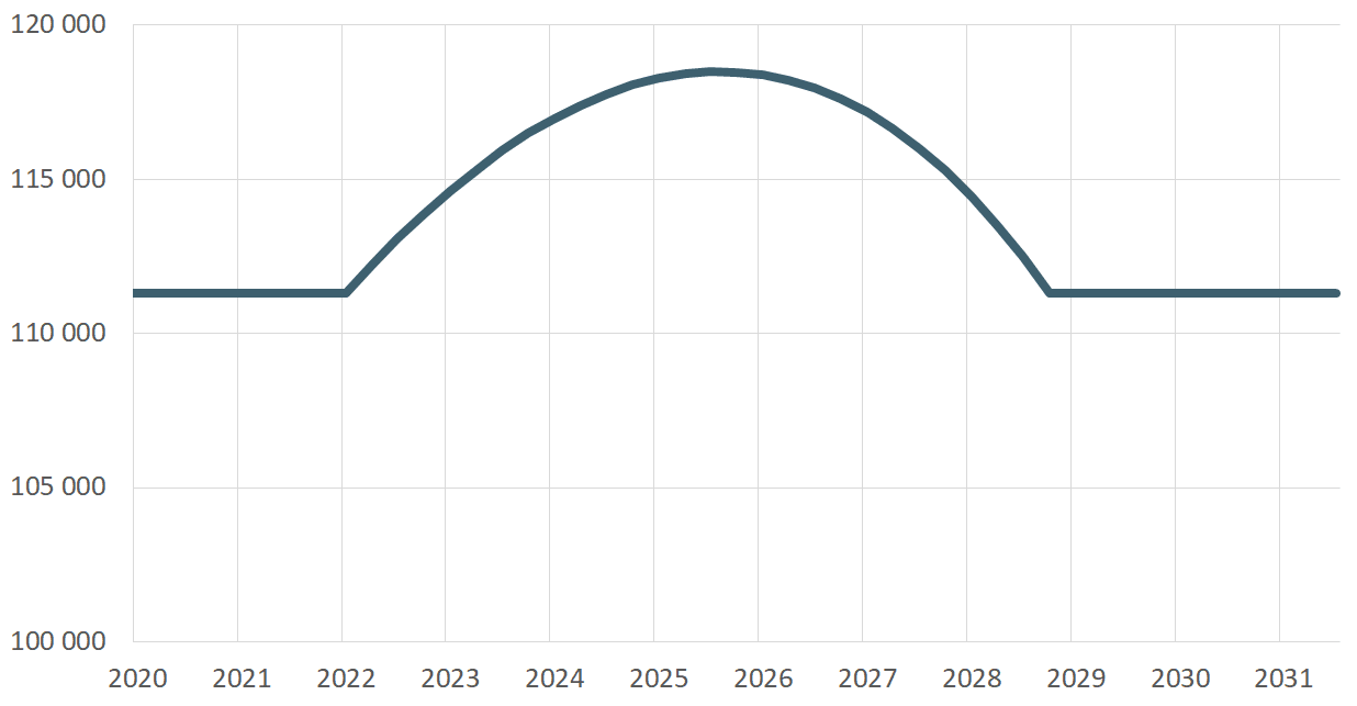 Zkusme si tedy spočítat, jak se projeví zmíněný pokles počtu nových smluv o stavebním spoření na průměrné naspořené částce. Řekněme, že do roku 2022 bylo uzavíráno 476 000 nových smluv o stavebním spoření ročně a od roku 2023 se toto číslo snížilo na 368 000. Když dosadíme další parametry odpovídající této situaci, dostaneme následující vývoj průměrné naspořené částky.