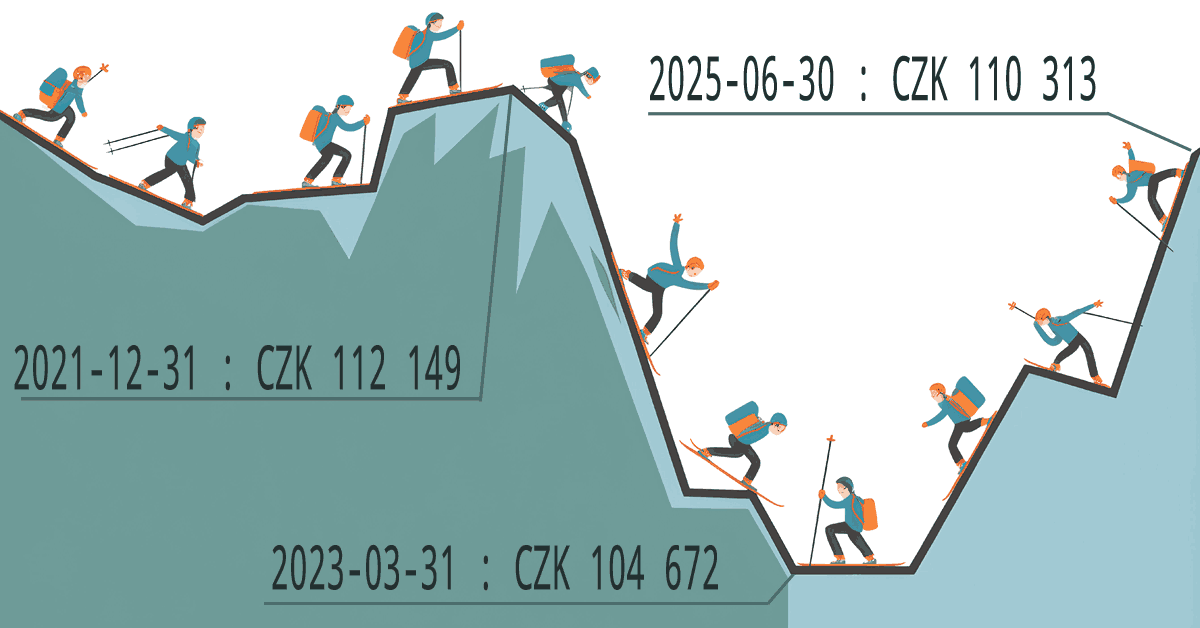 Průměrná naspořená částka po řadu let postupně rostla a někdy v roce 2017 se ustálila na hodnotě kolem 111 tisíc Kč. Během roku 2022 však klesla ke 105 tisícům Kč, zde se odrazila a od té doby stoupá vzhůru. Poslední údaj (z poloviny letošního roku) je 110 313 Kč, tedy téměř stejná hodnota, jako na konci roku 2021.