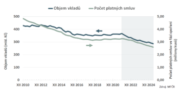 Průměrná naspořená částka je tedy v posledních letech ovlivňována dvěma trendy které prozatím působí proti sobě a jsou mírně časově posunuté. Začalo to omlazením kolektivu střadatelů, kdy klienti, kteří spořili podstatně déle, než šest let, začali ukončovat své smlouvy o stavebním spoření. Tím se snížil jak počet platných smluv, tak i zůstatek. Zůstatek však klesl podstatně více, protože byly ukončovány starší smlouvy s vyššími naspořenými částkami. Výsledkem je pokles průměrného vkladu začínající v roce 2022.Druhým trendem je pokles počtu nově uzavíraných smluv, který přišel v roce 2023. Ten se projevuje dočasným růstem průměrné naspořené částky. Pokud nedojde ke změně chování střadatelů, dosáhne průměrná naspořená částka v příštím roce svého lokálního maxima, načež se vydá na cestu zpět.